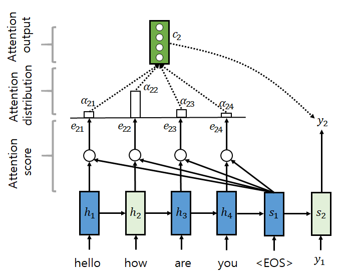 Attention 은 디코더의 출력 단어를 예측하는 시점에 연관이 있는 입력 단어에 집중해서 전체 입력을 다시 살펴본다. 즉 y_i 를 선택할 때 인코더 출력의 h_j를 a_ij 만큼 이용한다. y_i 의 벡터 c_i 는 ∑a_ij*h_j 가 된다. attention score 는 현재 디코더 출력과 인코더 은닉 상태를 통해 계산하고, softmax 함수를 통과시켜 벡터를 생성한다. 이 벡터와 현재 디코더 출력은 다음 디코더 히든 상태를 출력한다.