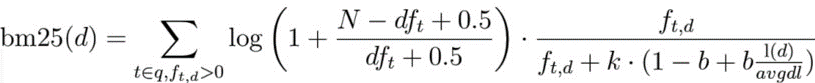 BM25 는 TF-IDF 의 코사인 유사도를 정규화하고 평활화(smoothing)한다. 곱셈의 왼쪽 항이 IDF 이고, 오른쪽 항이 TF 를 정규화 한 것이다. TF 부분부터 보자면, f_td 는 문서 d 에서의 t 의 빈도이다. 분모의 k, b 는 상수 파라미터이며, 해당 문서 길이 l(d) 를 평균 문서 길이 avgdl 로 나눈값도 정규화에 쓰인다. IDF 부분의 N 은 전체 문서, df_t는 해당 단어를 포함하는 문서의 개수이며 0.5 를 더함으로써 분모가 0이 되는 일이 없도록 smoothing 을 한다. cf. 라플라스 평활화
