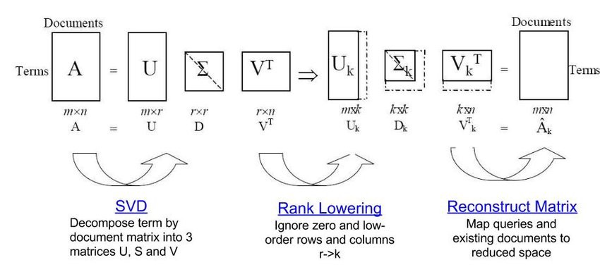 LSA 는 위해 특잇값 분해(SVD, Singular Value Decomposition)를 사용하여 용어-문서 행렬(또는 용어 대신 TF-IDF)로부터 주제-문서 행렬을 생성한다. SVD 는 원래의 용어-문서 행렬을 세개의 핼렬 곱으로 분해하는데, U, V는 직교 행렬(역행렬과 전치행렬이 같음)이며, S(D, 또는 시그마)는 대각행렬이다. 이때 대각 행렬 S의 대각원소를 행렬 A의 특이값(singular value)라고 한다. 이 S 의 크기가 주제의 개수이며, 크기를 줄일 경우, 절단된 SVD(Truncated SVD)라고 한다.
