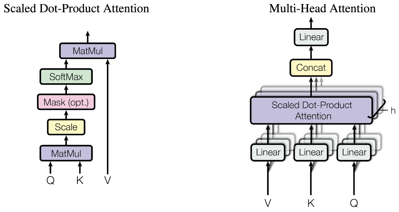 이러한 단어 임베딩으로 우선 인코더에서 Self Attention 을 병렬적으로(Multi-head) 진행한다. Attention 은 특정 단어(query)와 다른 단어(key,value)의 관계를 계산하는데, 먼저 qurey 와 전체 key 행렬을 내적해서 attention score 를 구하고 softmax 확률 값으로 만든다. 그리고 이 확률 벡터를 다시 value 와 곱하면 q,k의 관계가 v 에 가중된 결과를 얻을 수 있다.